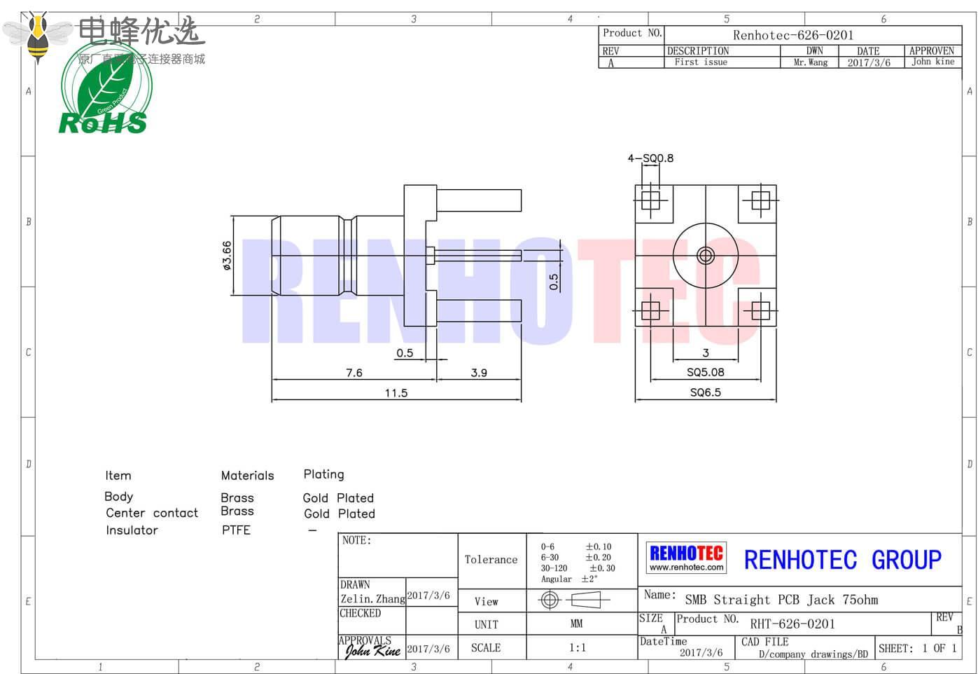 - PCB板端,母头,直插,RF射频同轴,SMB连接器,75欧姆;