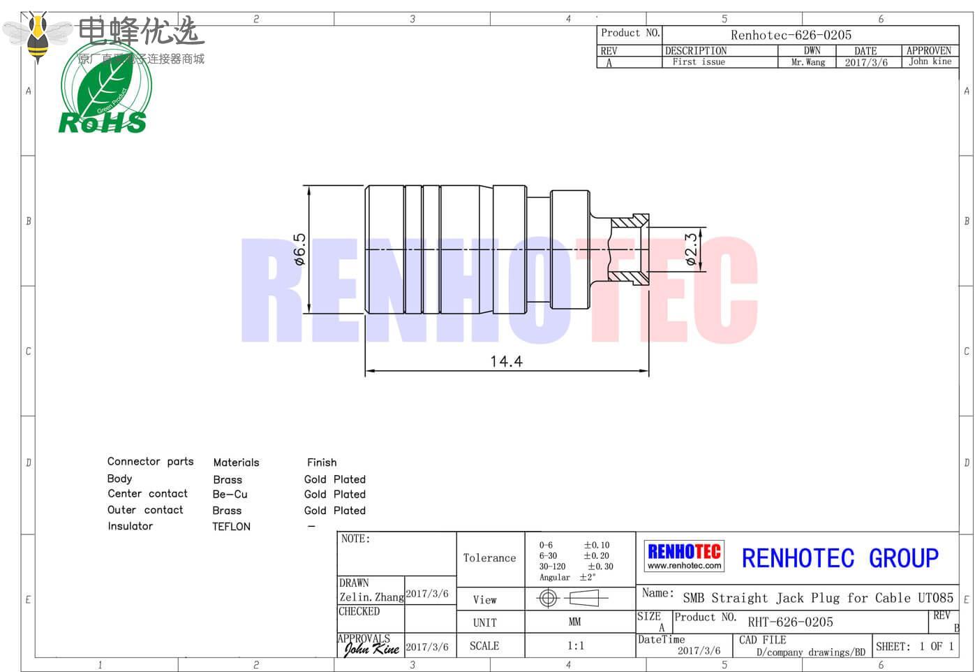 接RG142,RG405线缆时为250 V rms - 中心接触电阻: ≦ 6.0mΩ (Milliohms max.)