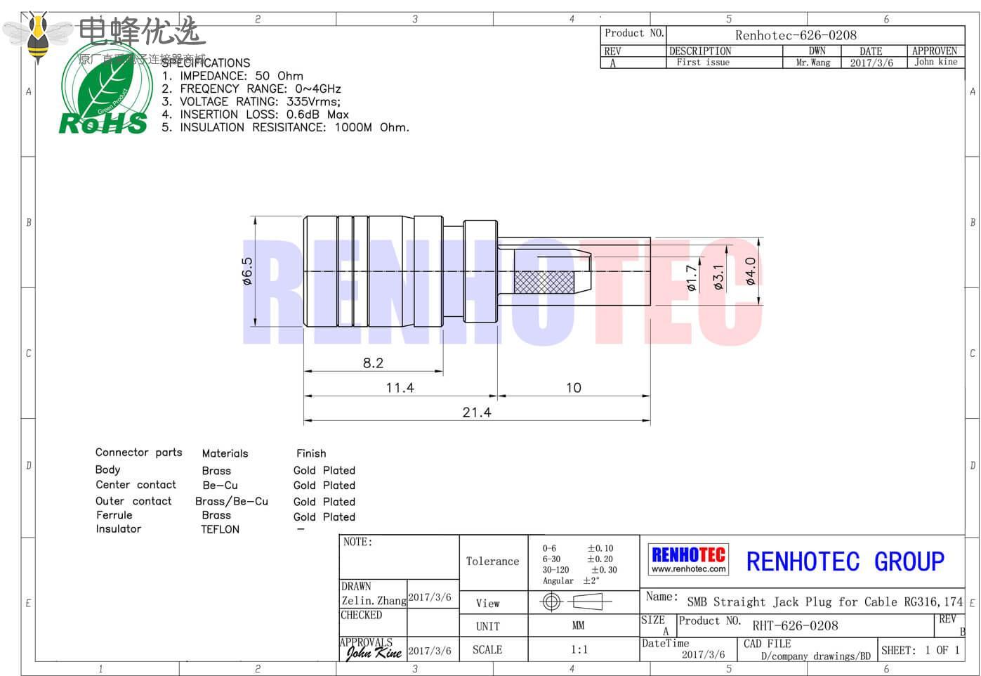 - 公头,直式,RF射频同轴,SMB连接器,50欧姆,同轴线缆,RG316,压接;