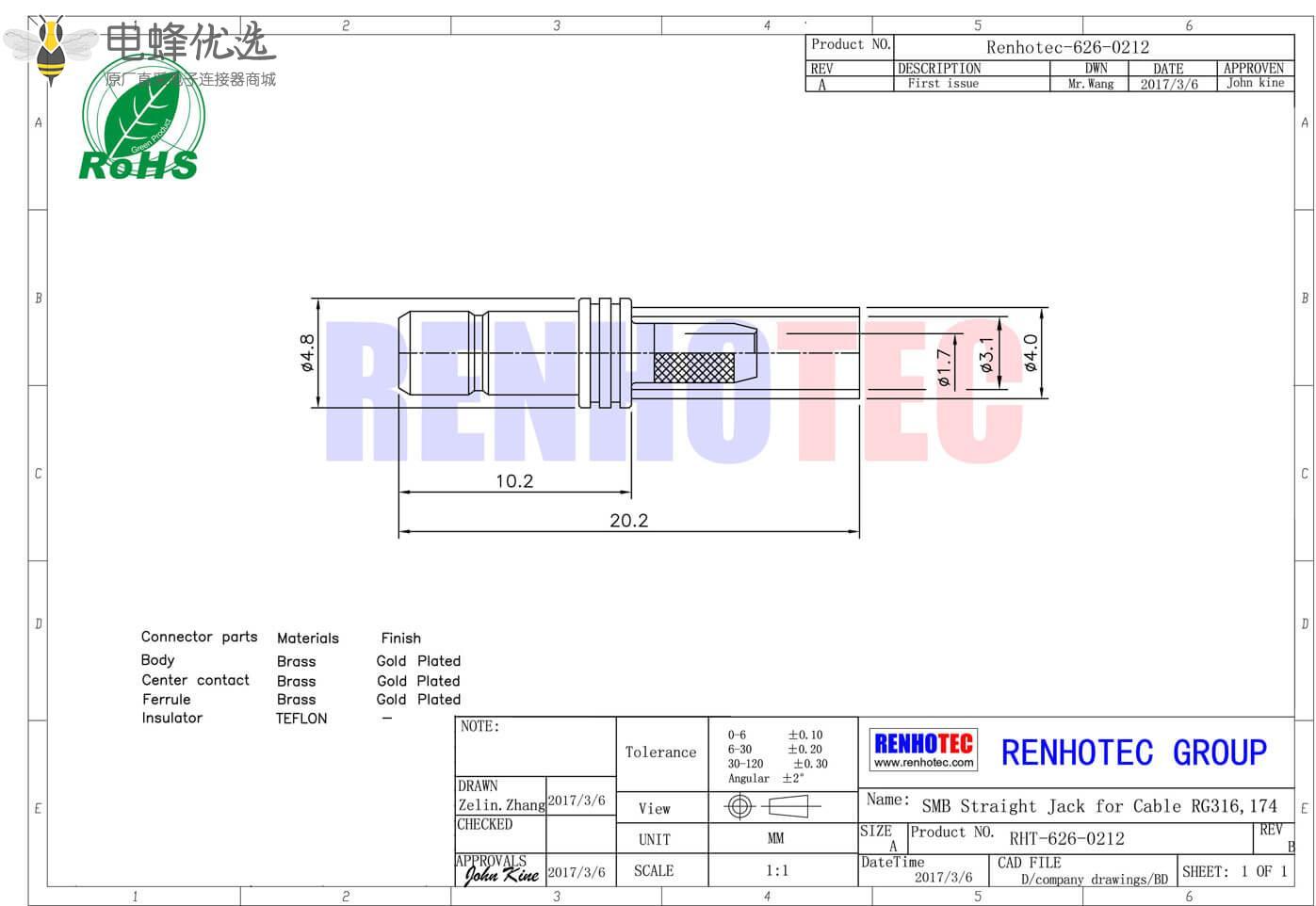 - 母头,直式,RF射频同轴,SMB连接器,50欧姆,同轴线缆,压接,RG316,174;
