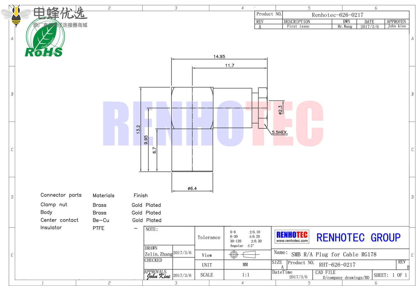 - 公头,弯式,RF射频同轴,SMB连接器,50欧姆,同轴线缆,螺母锁紧,RG178;