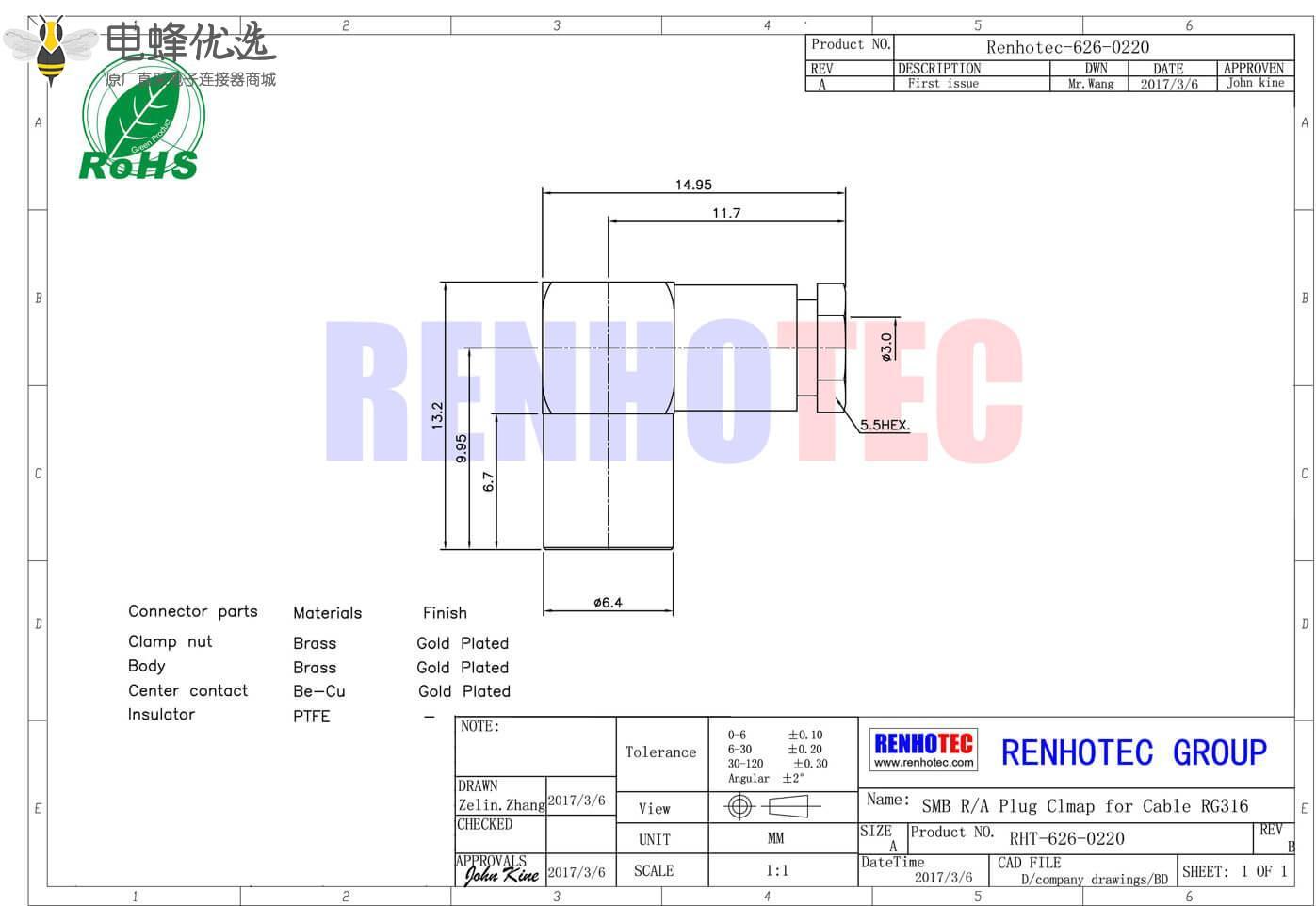 - 公头,弯式,RF射频同轴,SMB连接器,50欧姆,同轴线缆,螺母锁紧,RG316;