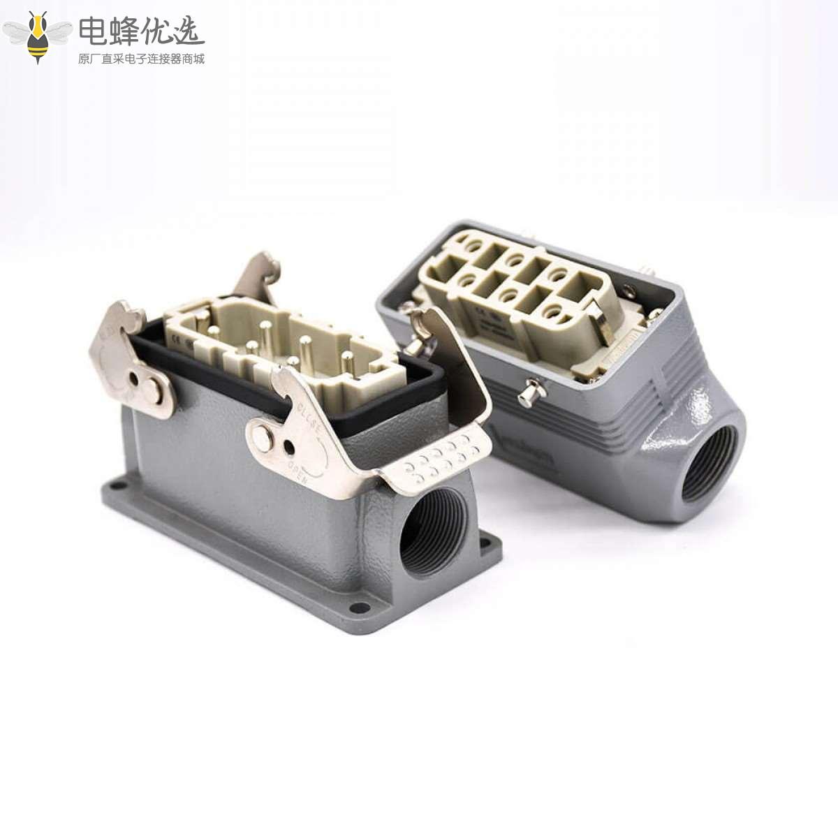 H16B重载连接器,表面安装,斜出口,铁扣,四耳,双扣,公母对接,6芯,镀银,M25;