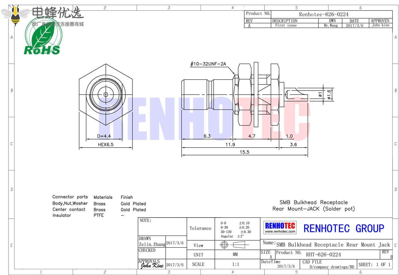 接RG142,RG405线缆时为250 V rms - 中心接触电阻: ≦ 6.0mΩ (Milliohms max.)