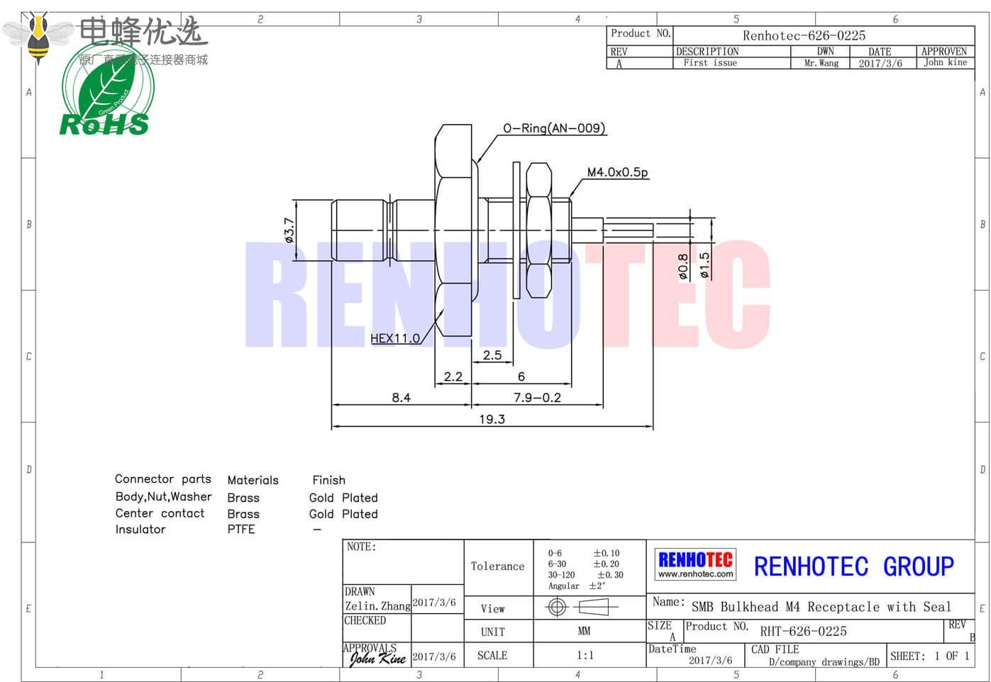 - 母头,直式,RF射频同轴,SMB连接器,50欧姆, 面板安装, 防水;