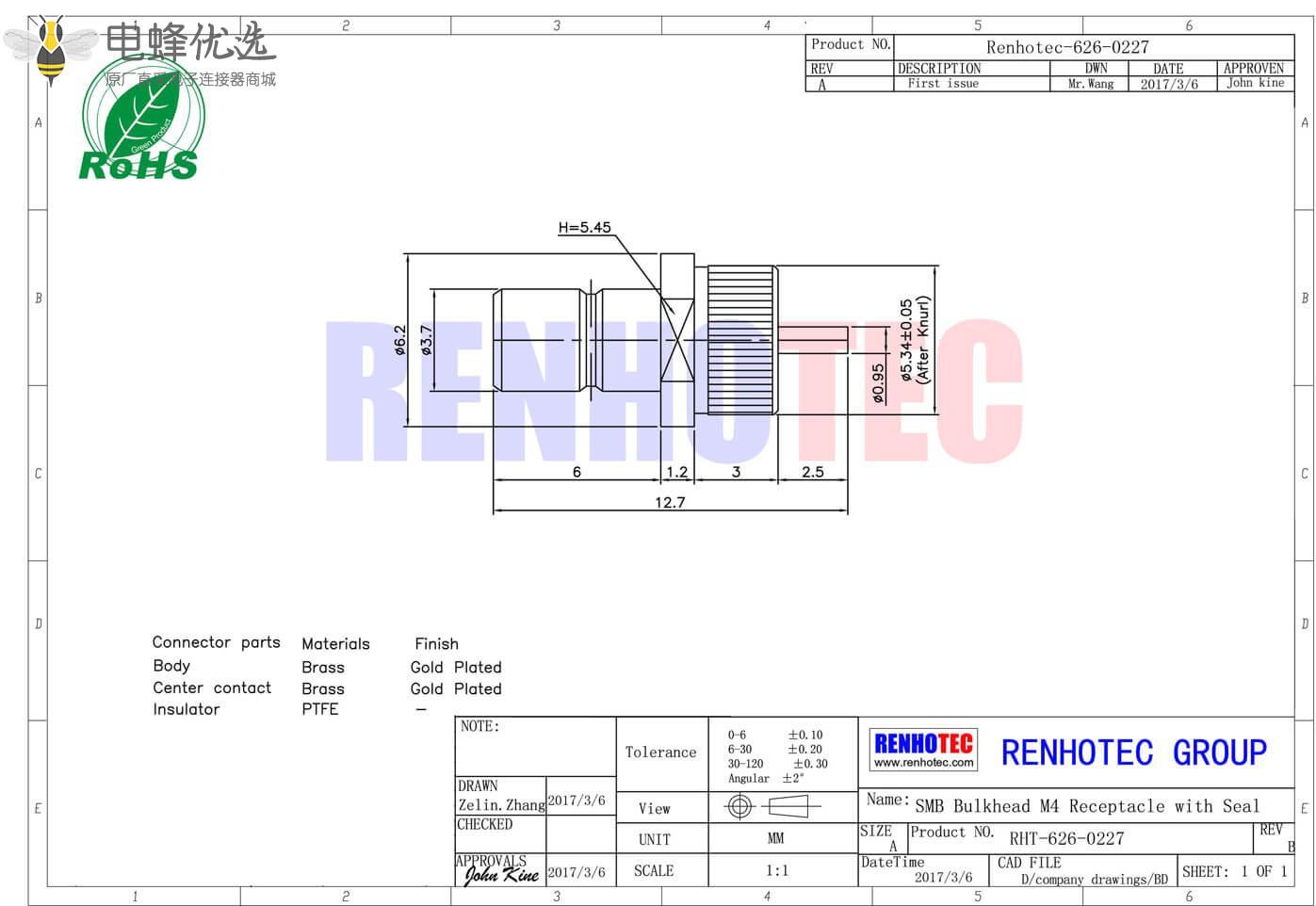 接RG142,RG405线缆时为250 V rms - 中心接触电阻: ≦ 6.0mΩ (Milliohms max.)