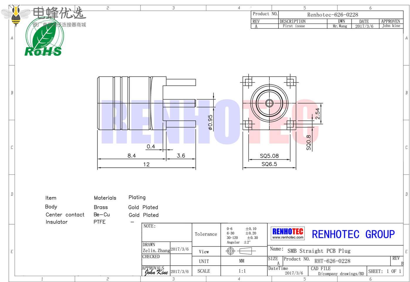 - PCB板端,公头,直插,RF射频同轴,SMB连接器,50欧姆;