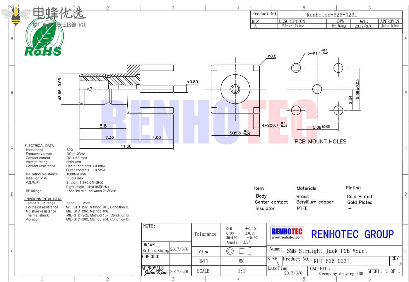 接RG142,RG405线缆时为250 V rms - 中心接触电阻: ≦ 6.0mΩ (Milliohms max.)
