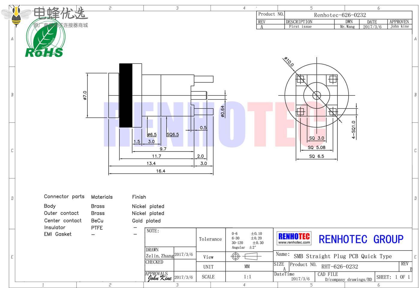- PCB板端,公头,直插,RF射频同轴,SMB连接器,50欧姆;