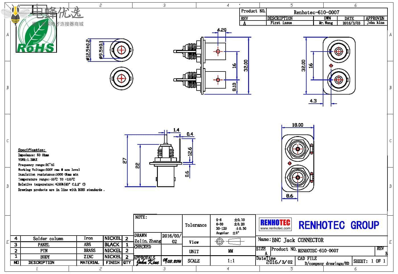 - PCB板端,母头,直式,RF射频同轴,BNC连接器,50欧姆;