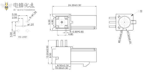 RF连接器,接PCB板,FAKRA公头,90度,D型,酒红色;