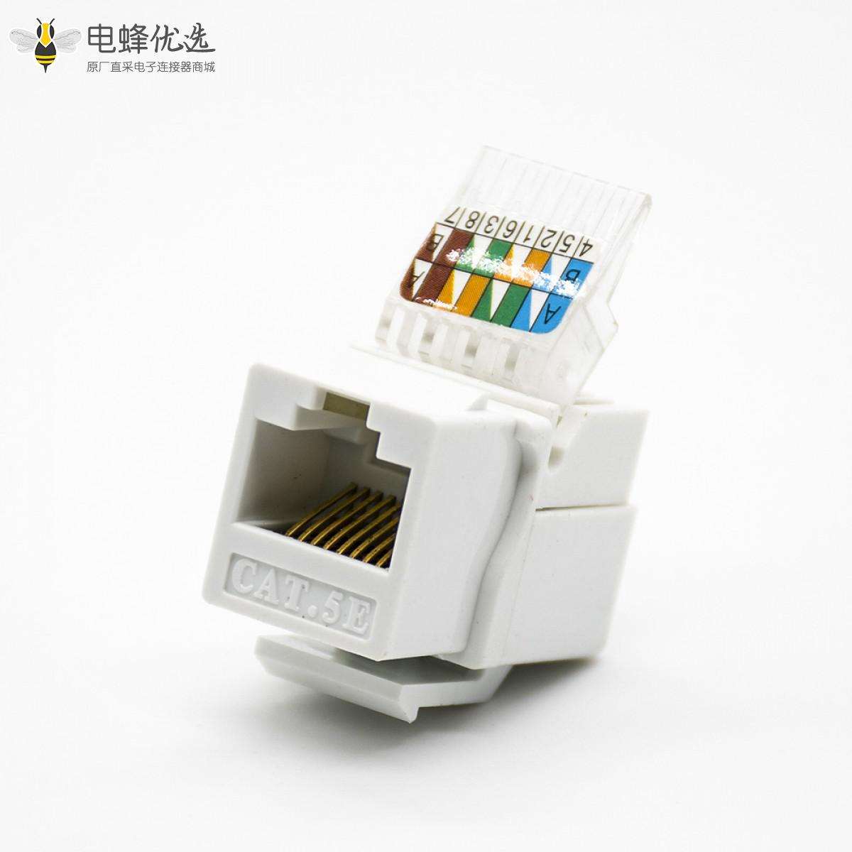 RJ45插座,8P8C,单端口,1*1,弯式90°,触头镀金,插孔,面板安装,非屏蔽,CAT5E,免工具;