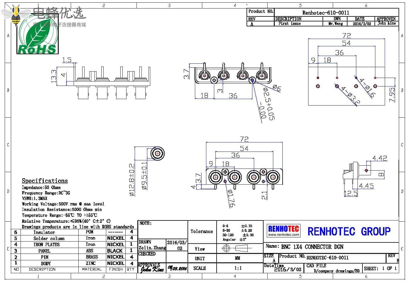 - PCB板端,母头,弯式,锌合金,RF射频同轴,BNC连接器,50欧姆;