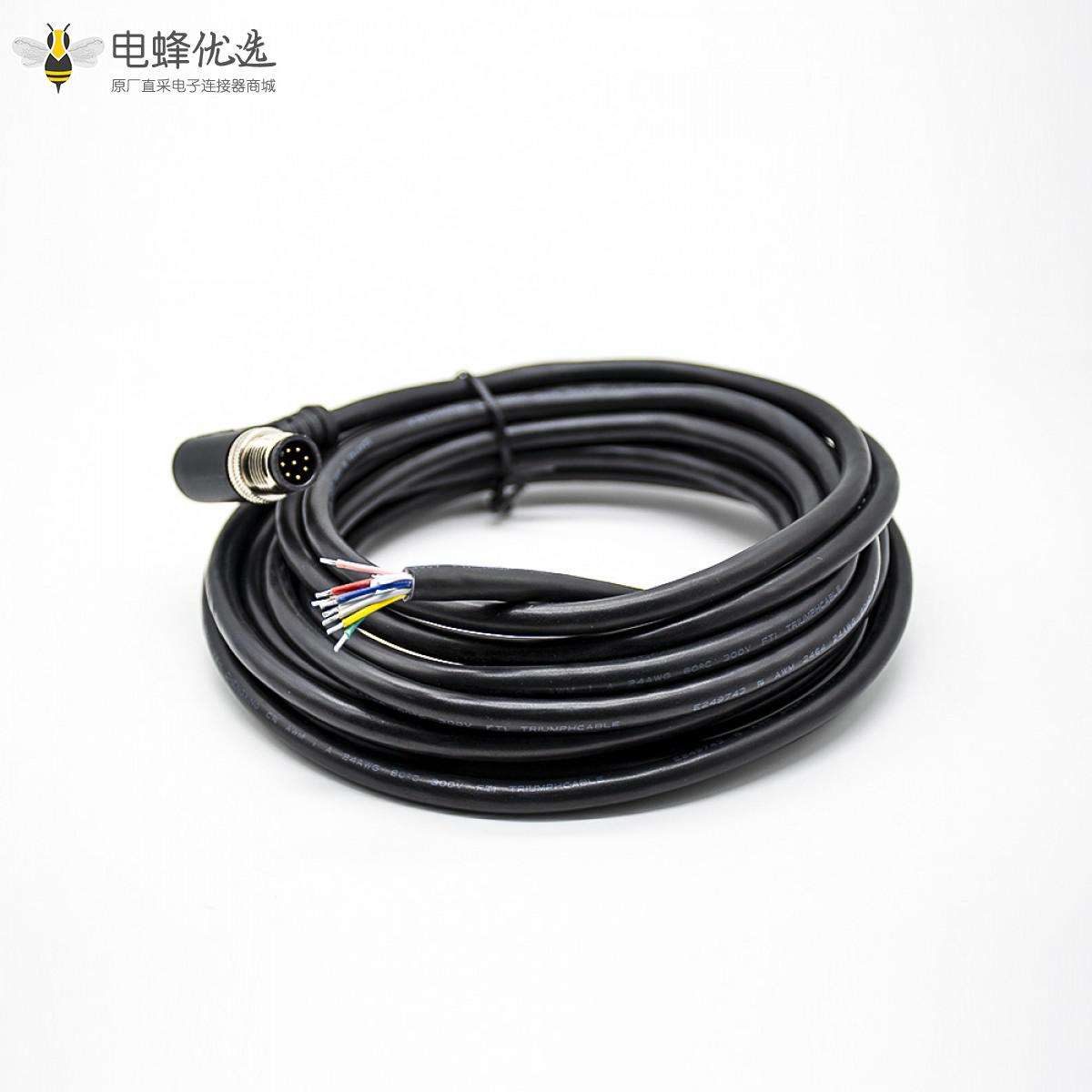 M12,A 编码,线束,8芯,公头,弯式,焊线,单边,不带屏蔽,5米;