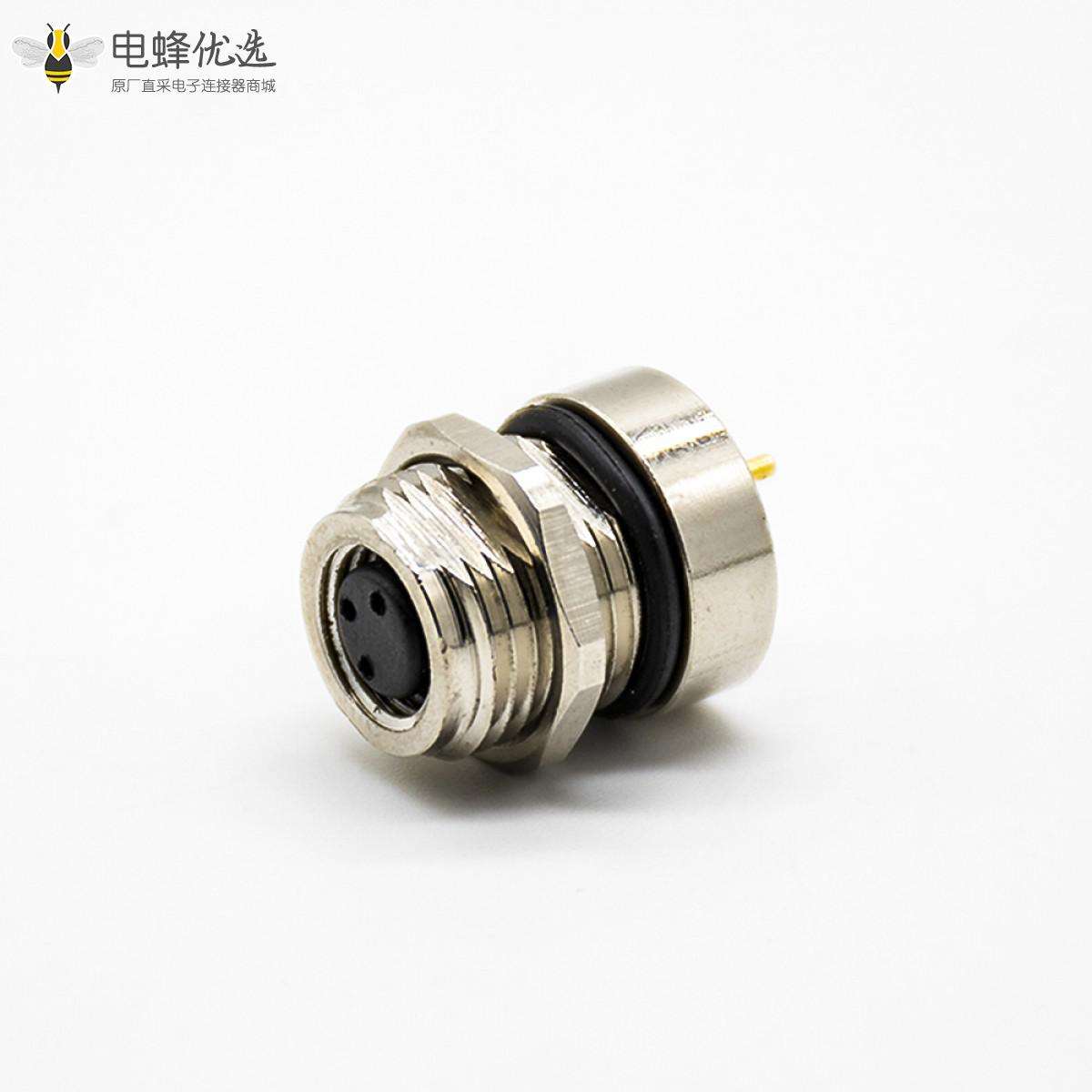 - M8板端插座,180°,3芯,母头,接PCB板,焊接式,前锁板,防水;