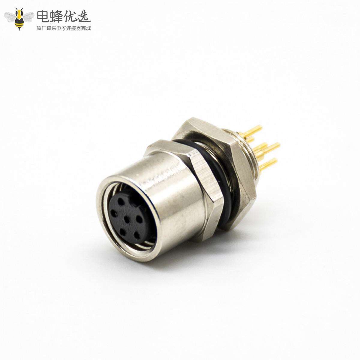 - M8板端插座,A扣,180°,6芯,母头,接PCB板,焊接式,后锁板,防水;