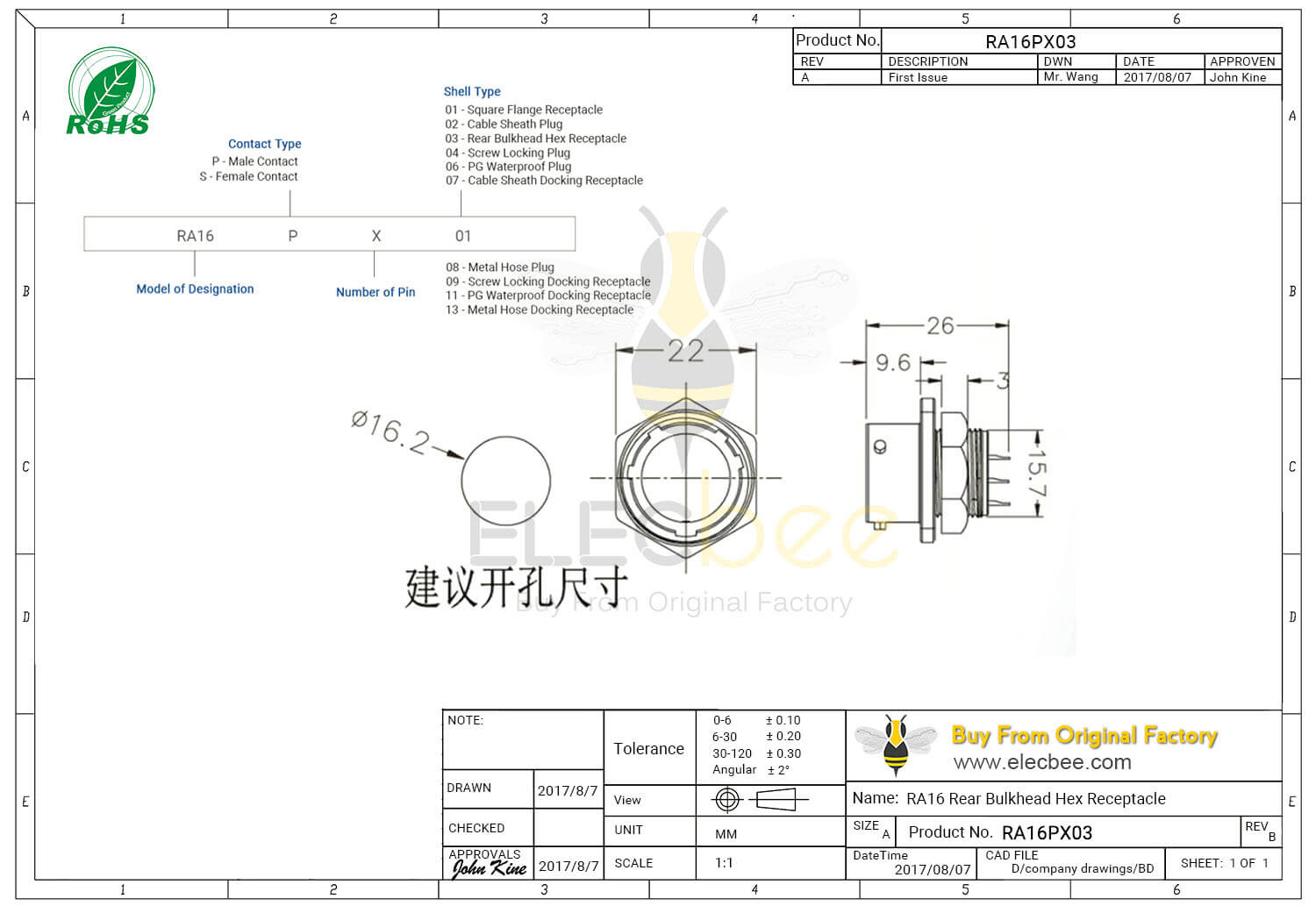 - 3芯, RA16 连接器, 后锁安装, 直式, 座件, 母头, 防水, 航空工业;
