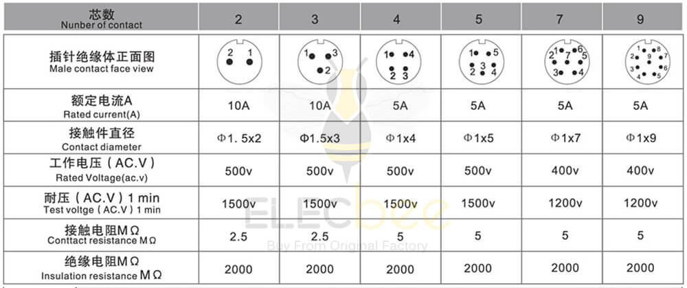 焊接芯件芯数排列及技术特性表