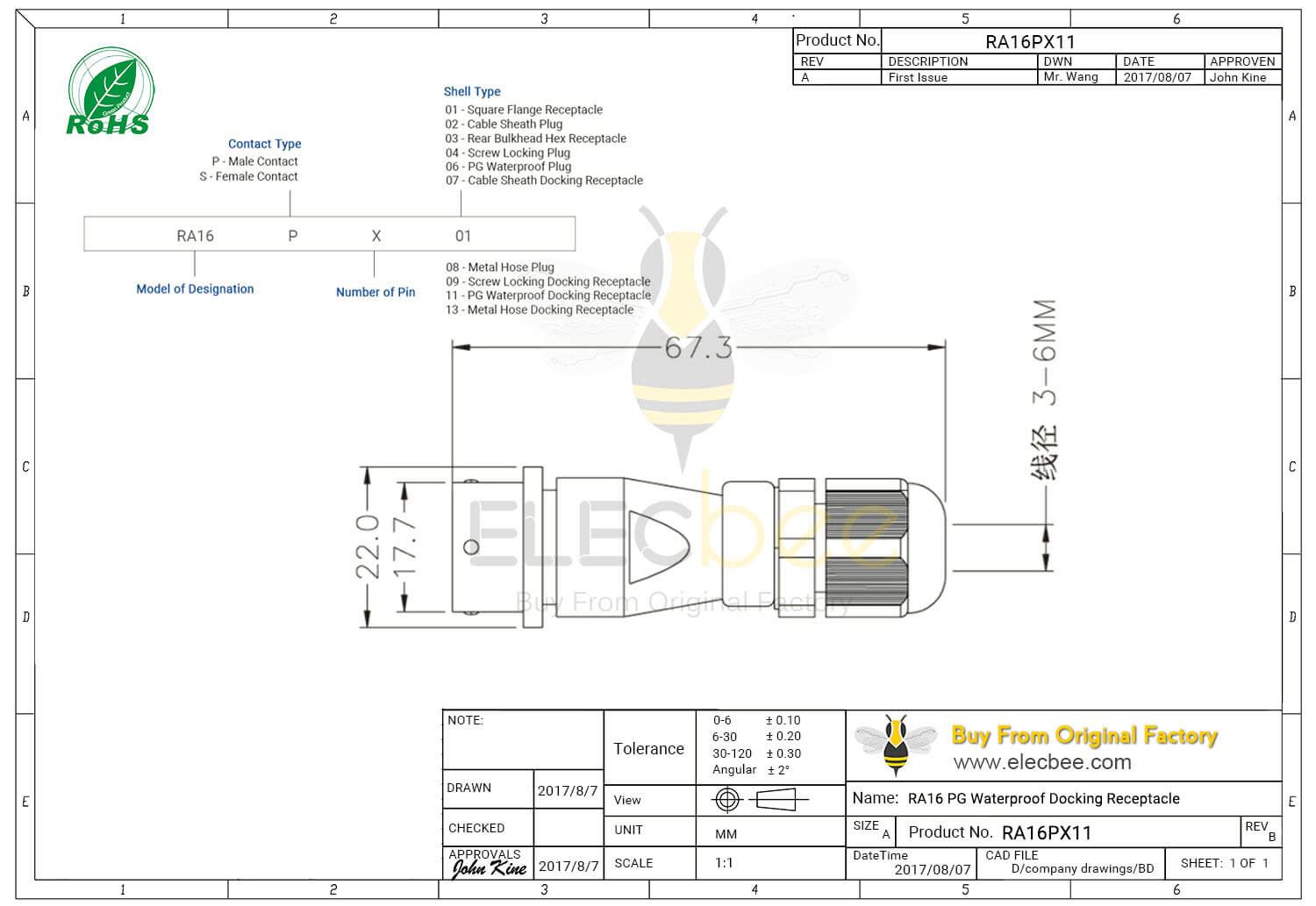 - 5芯, RA16 连接器, PG防水对接, 直式, 座件, 母头, 防水, 航空工业;