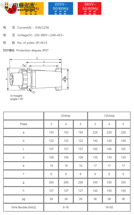 明装器具插座, 4芯, 公头, 16A, 380V-415V, IP44, 3P+E, 红色;