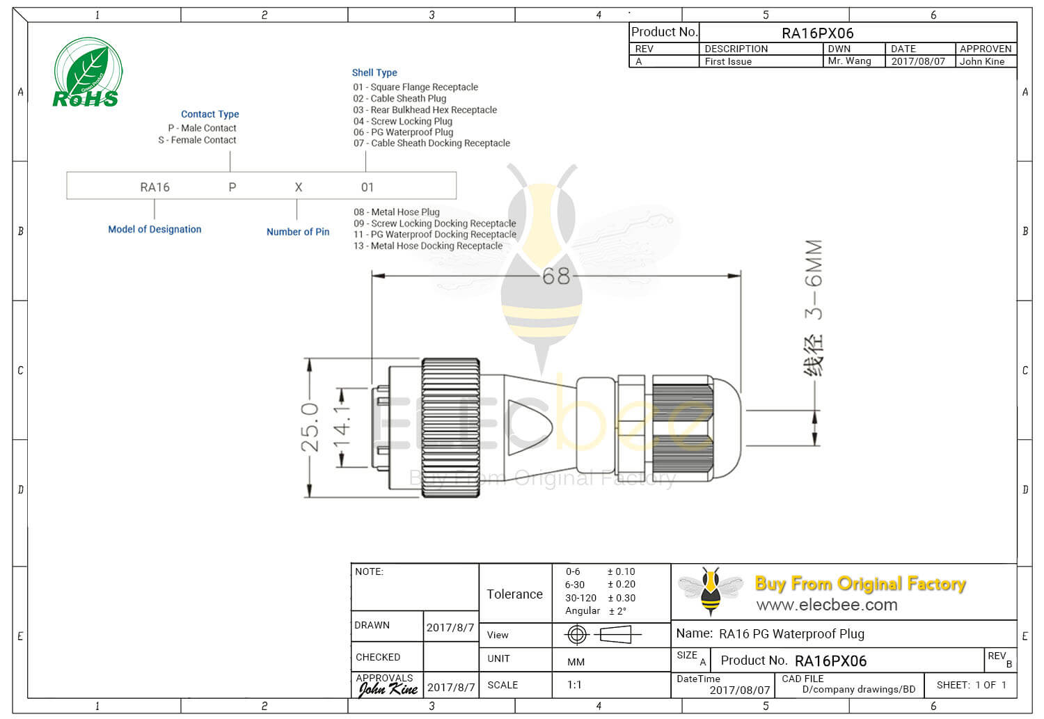 - 5芯, RA16 连接器, PG防水插头, 直式, 公头, 防水, 航空工业;