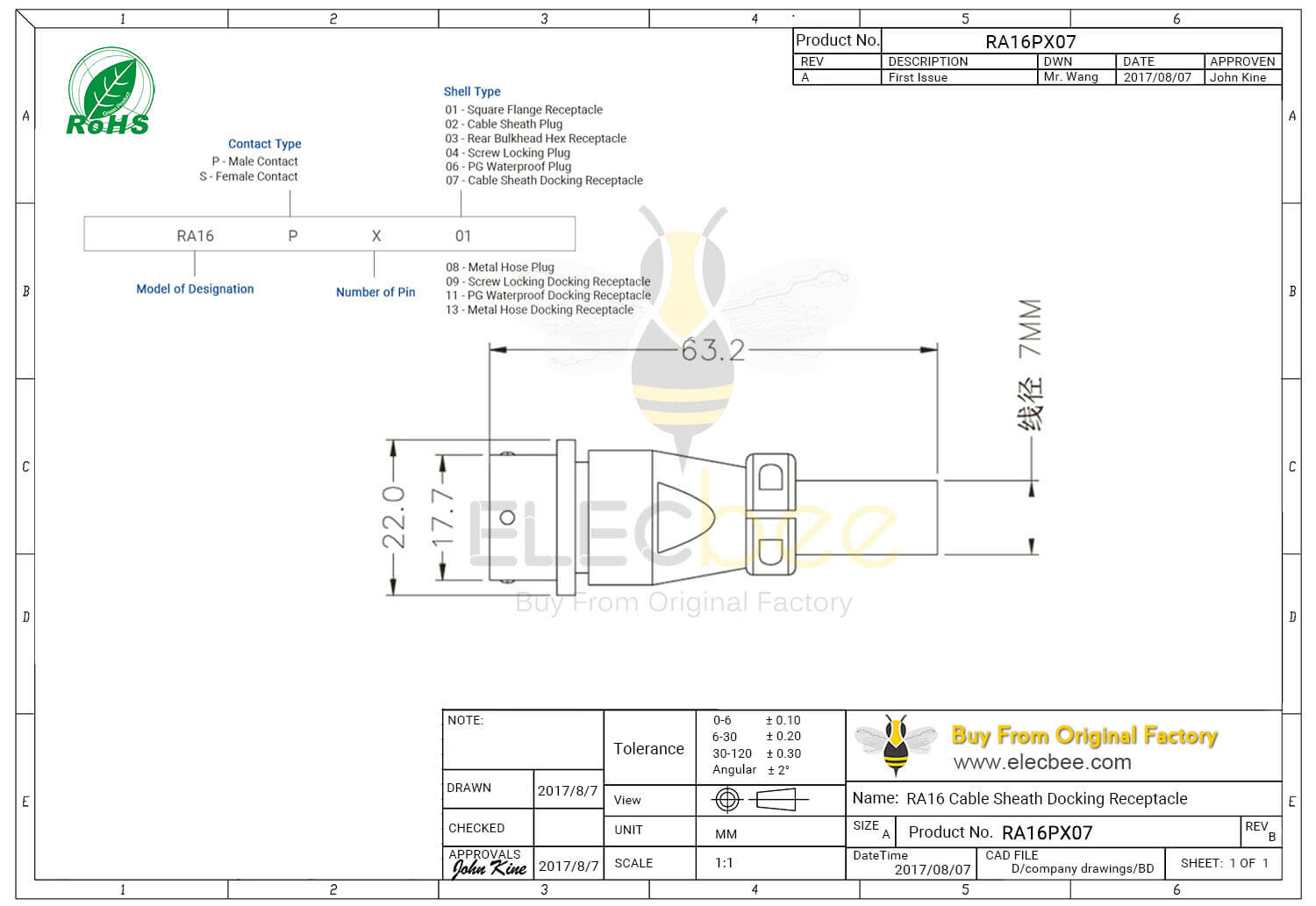 - 3芯, RA16 连接器, 电缆护套插头, 直式, 母头, 防水, 航空工业