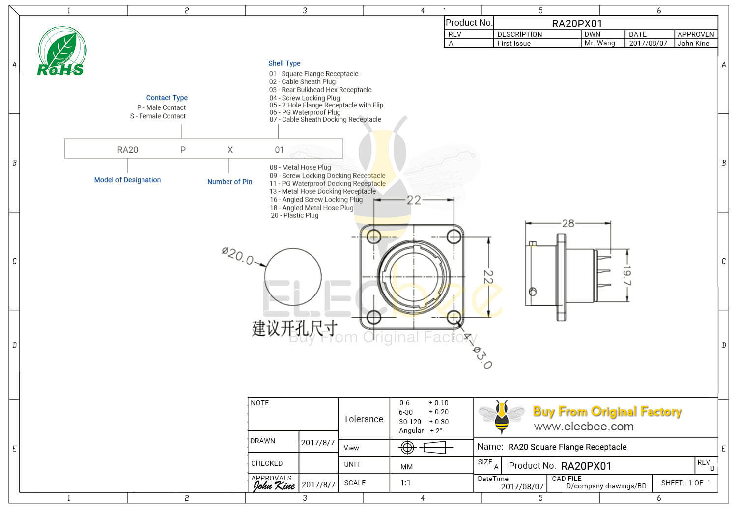 - 5芯, RA20 连接器, 4孔方形法兰, 直式, 座件, 母头, 防水, 航空工业;
