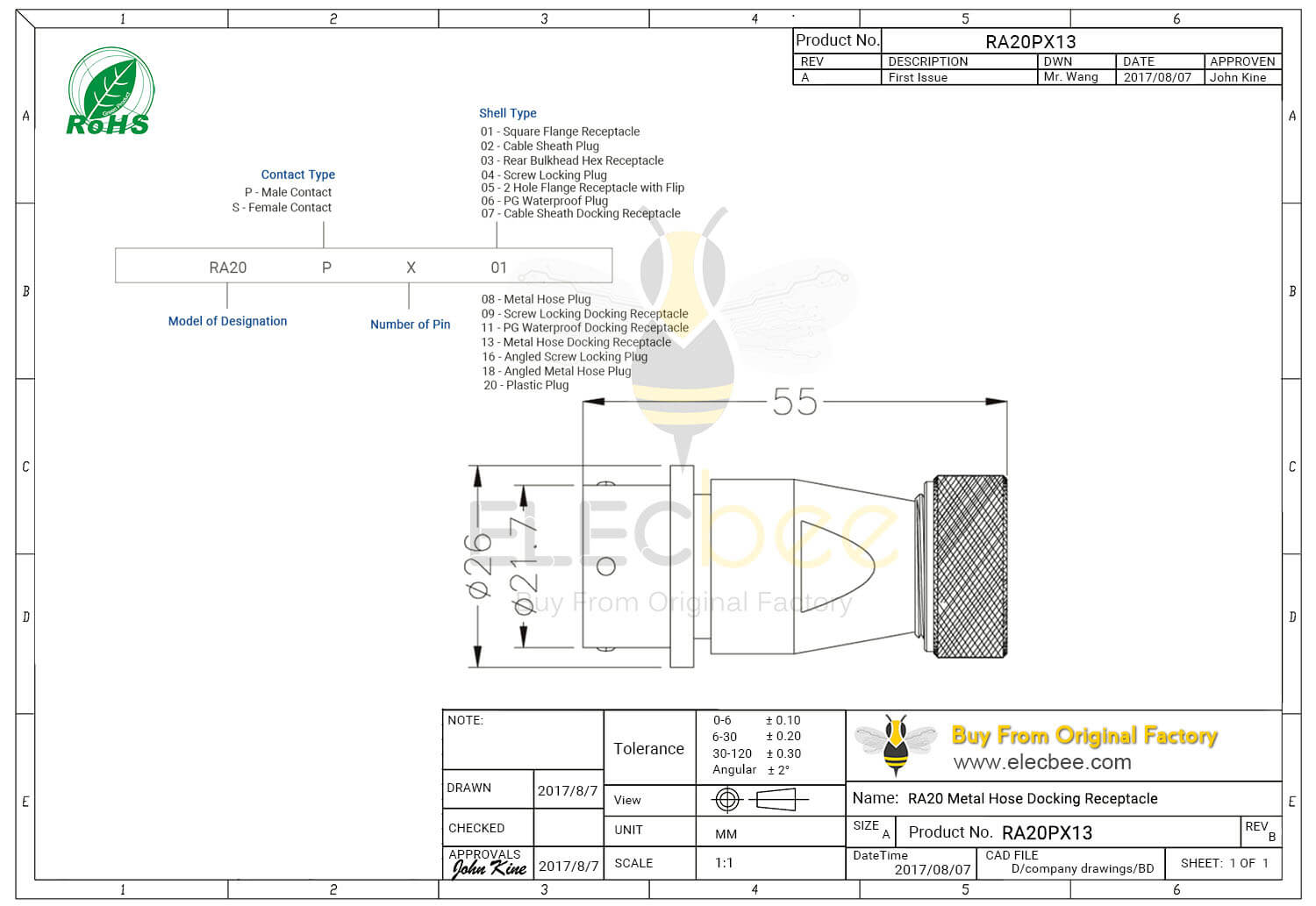 - 3芯, RA16 连接器, 金属软管对接, 直式, 座件, 母头, 防水, 航空工业;