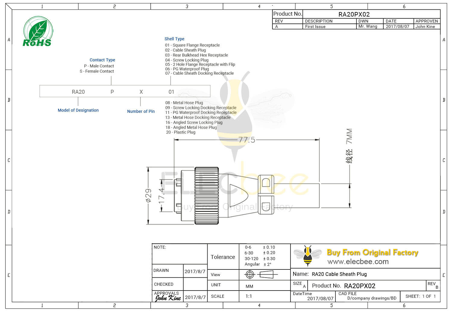 - 2芯, RA20 连接器, 电缆护套插头, 直式, 公头, 防水, 航空工业;