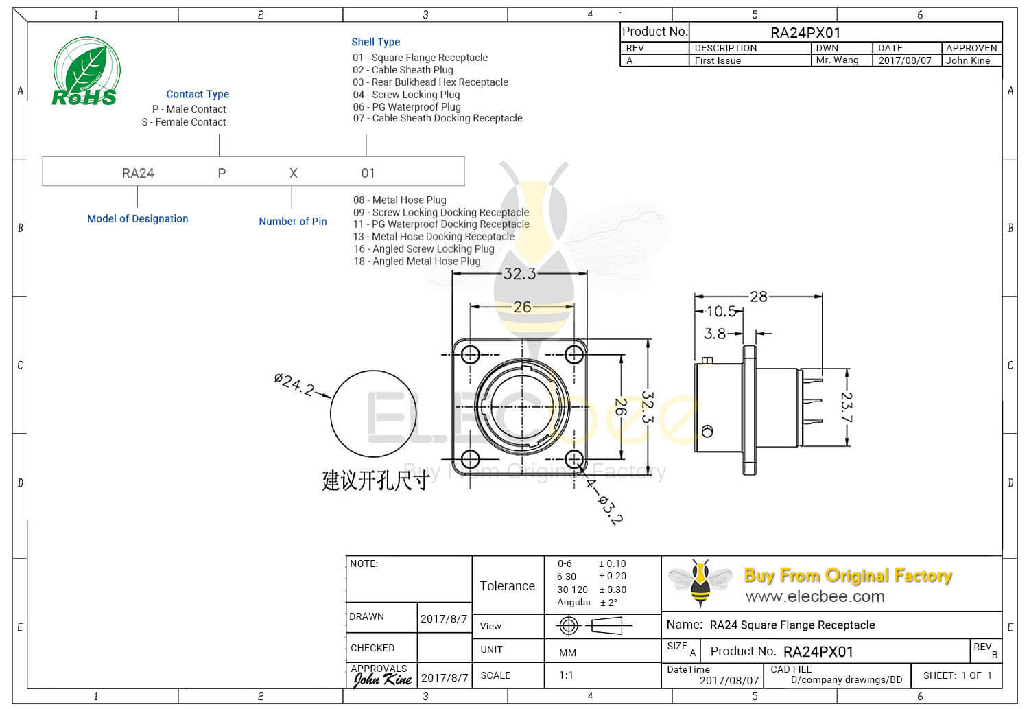 - 4芯, RA24, 4孔方形法兰, 直式, 插座, 母头, 防水, 航空工业圆形连接器;
