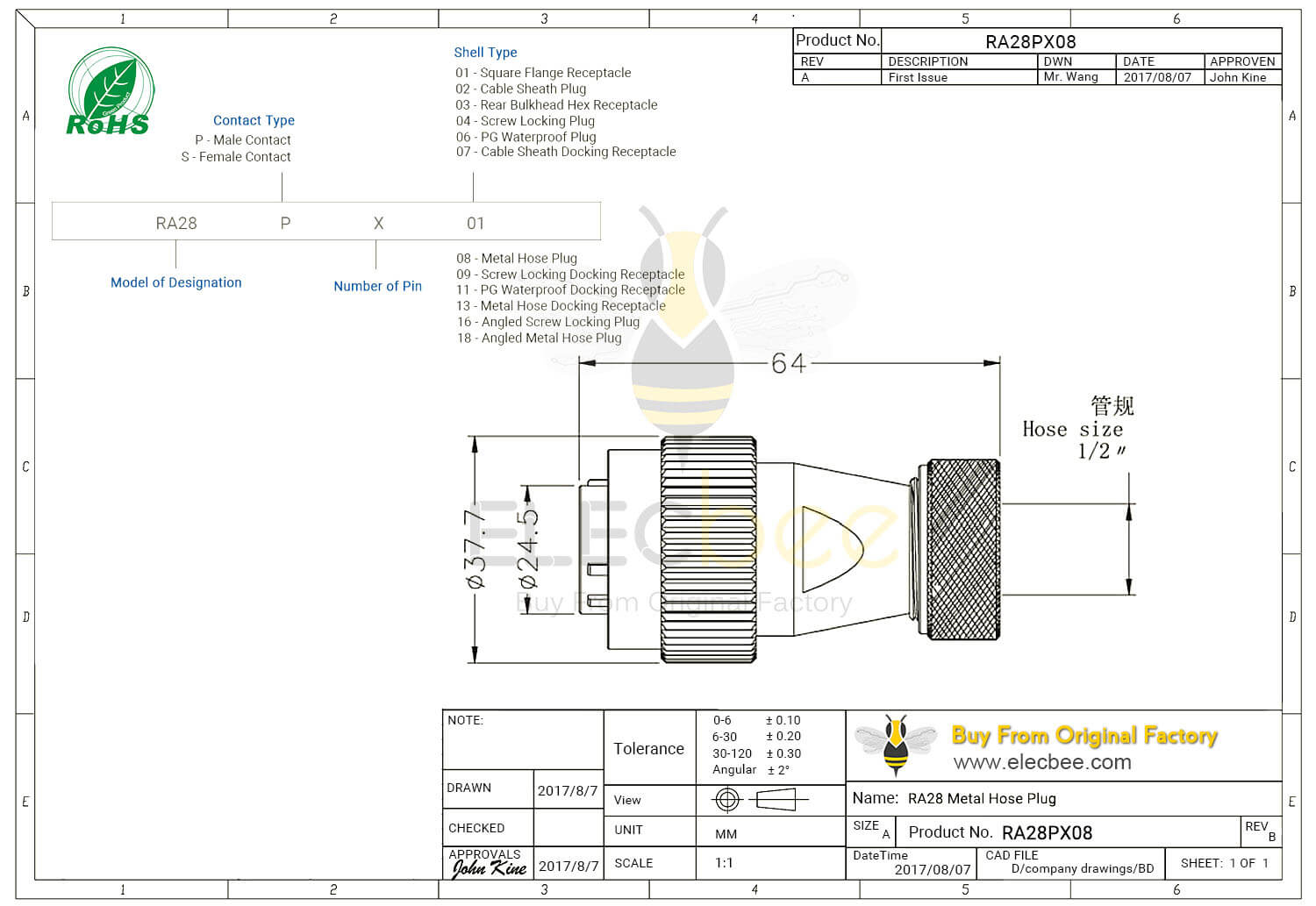- 18芯, RA28 连接器, 金属软管插头, 直式, 公头, 圆形工业防水航空连接器;