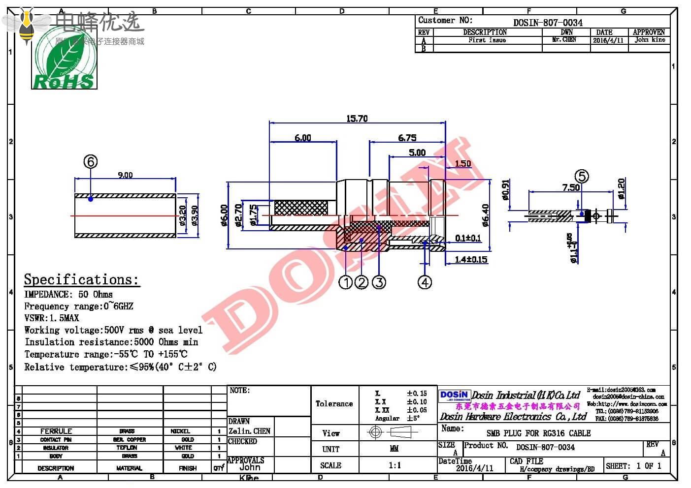- 公头,压接,RF射频同轴,SMB连接器,50欧姆,直式,同轴线缆,RG316;