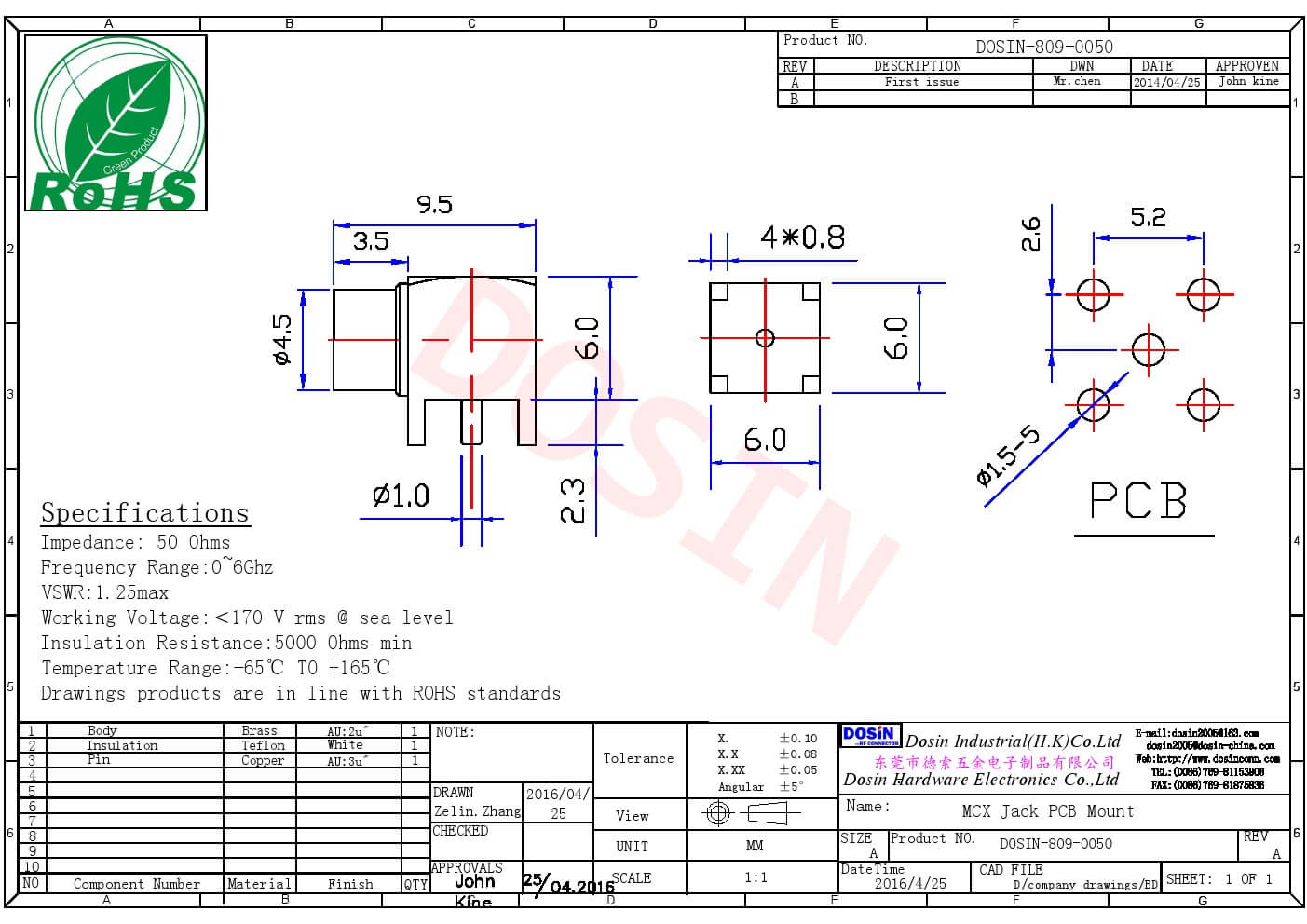 - mcx连接器,pcb板,母头,50欧,弯插;