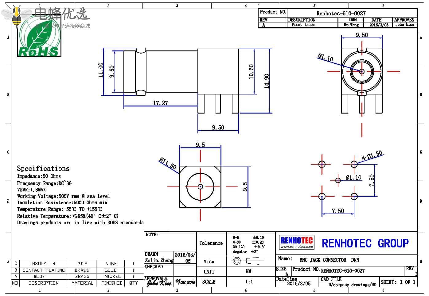 - 中心接触电阻:≦ 1.5 mΩ (Milliohms max.)