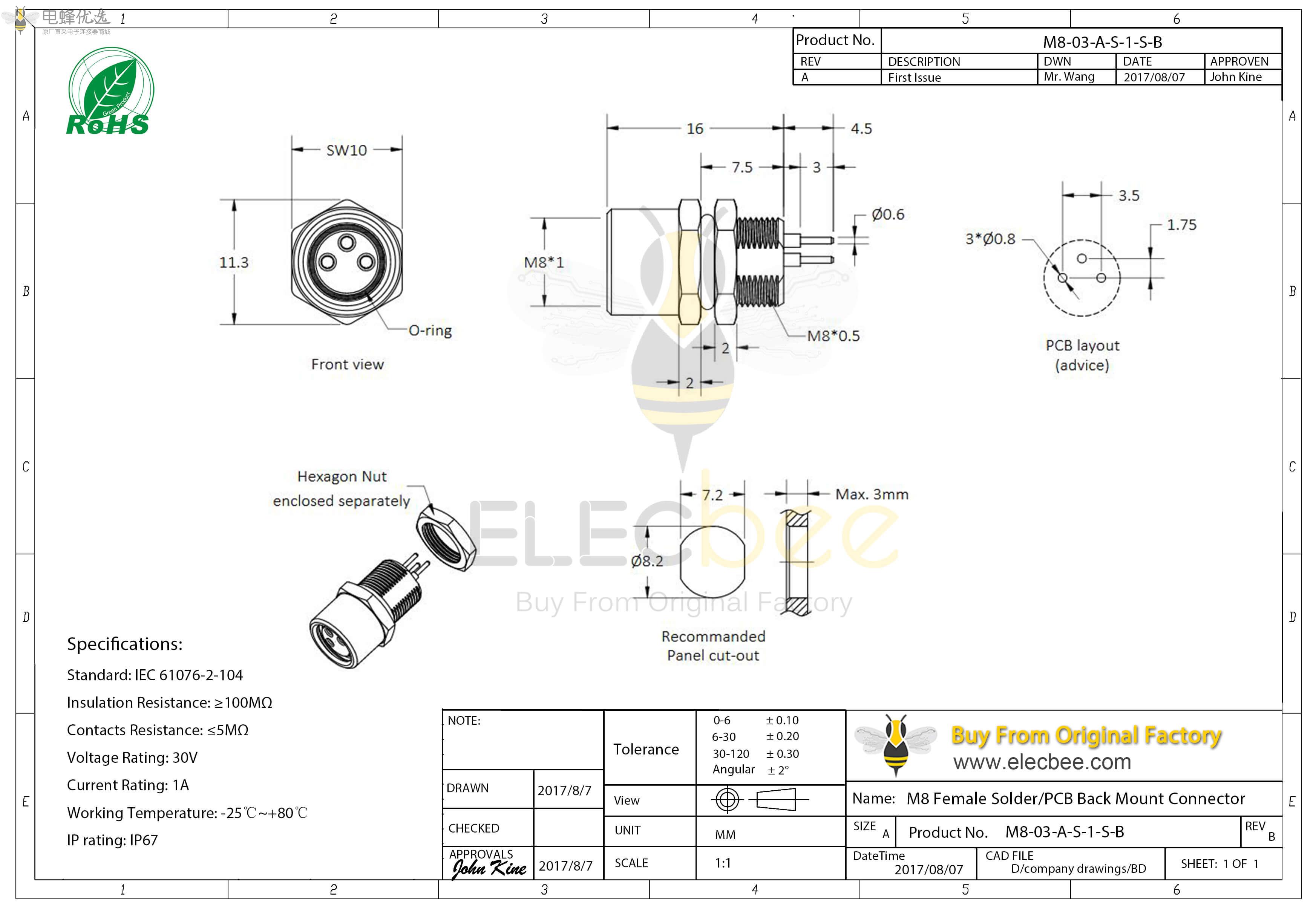 - M8, 3/4/6/8芯, A型, 母座, 后锁板, 直式, 防水, PCB ;
