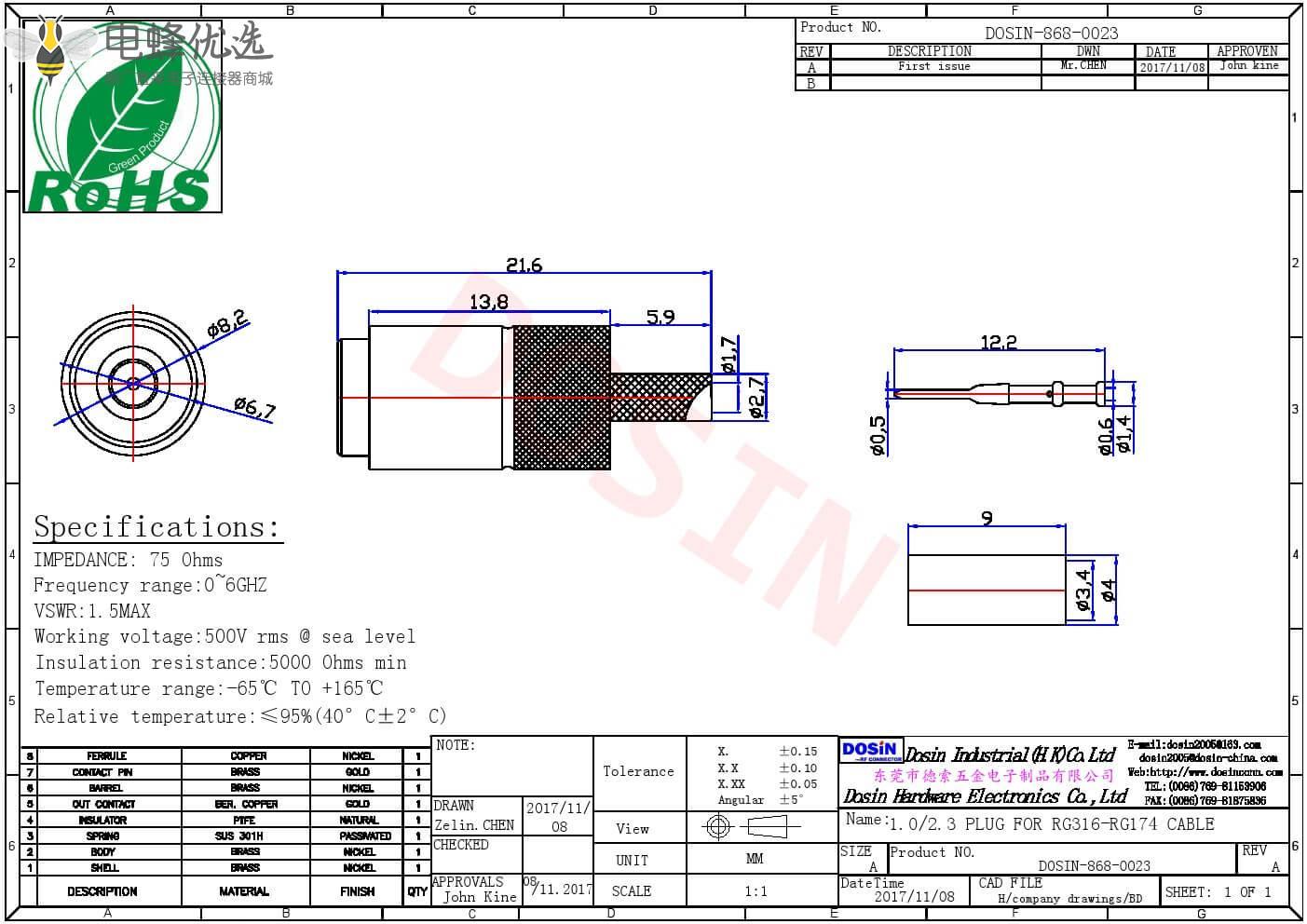 - DIN1.0/2.3连接器,直式公头,压接,接线;