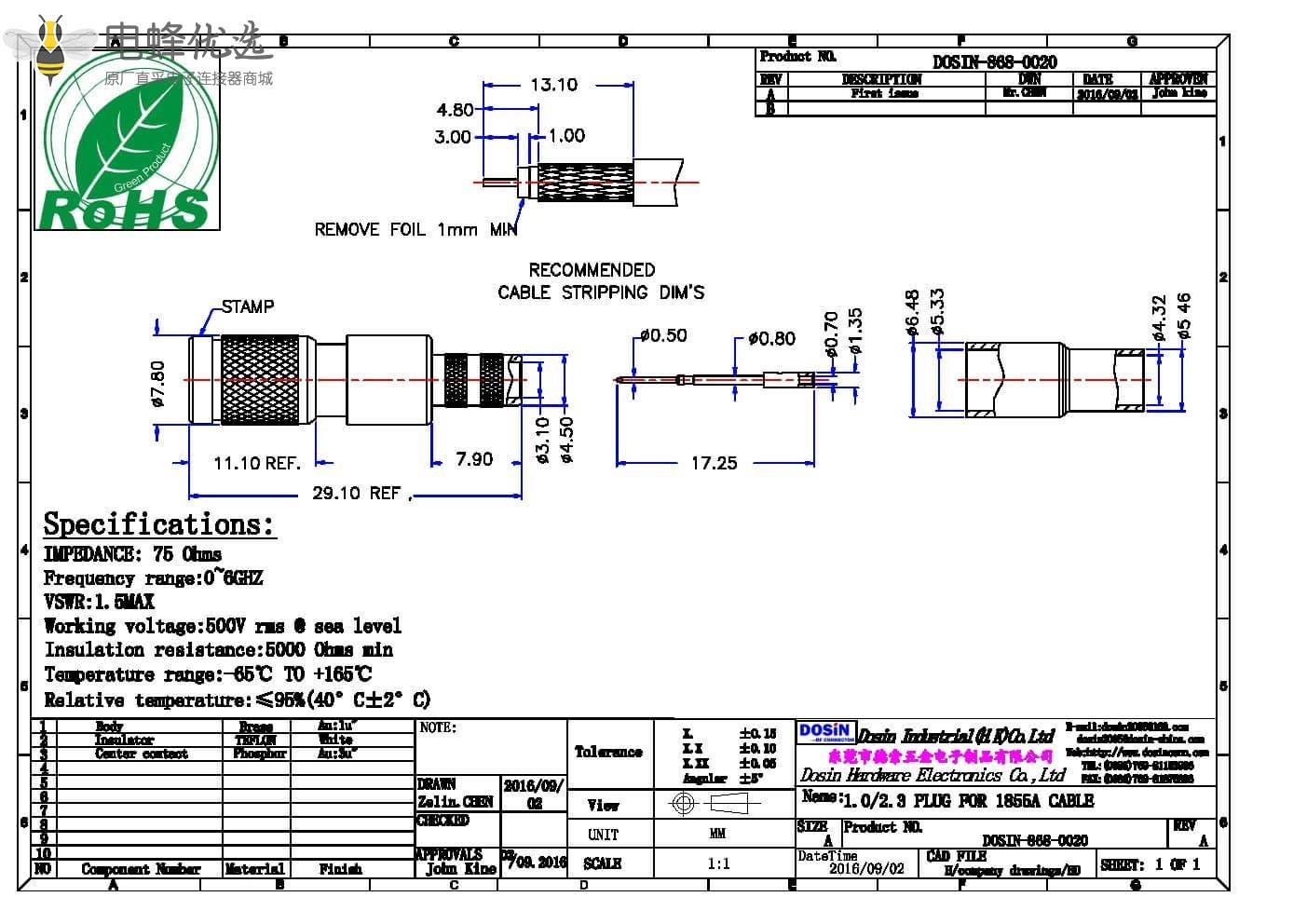 - DIN1.0/2.3连接器,公头,直式,接线,压接;