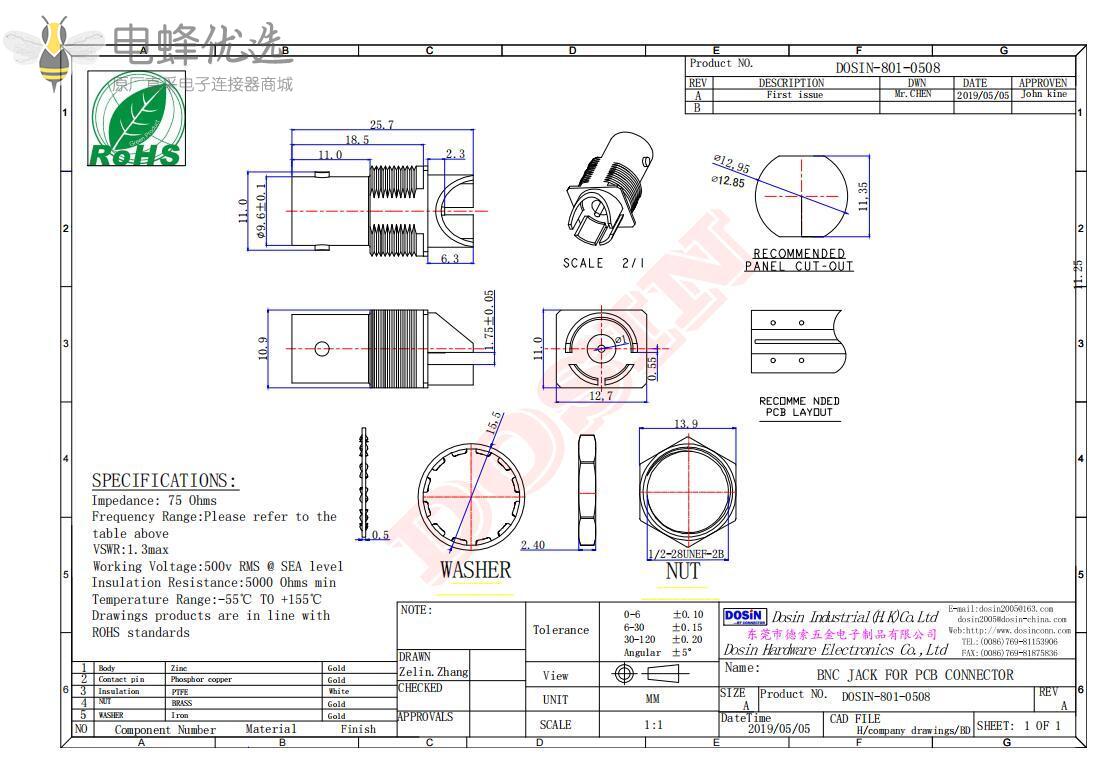 - PCB板端,母头,直式,镀金,RF射频同轴,BNC连接器,75欧姆;
