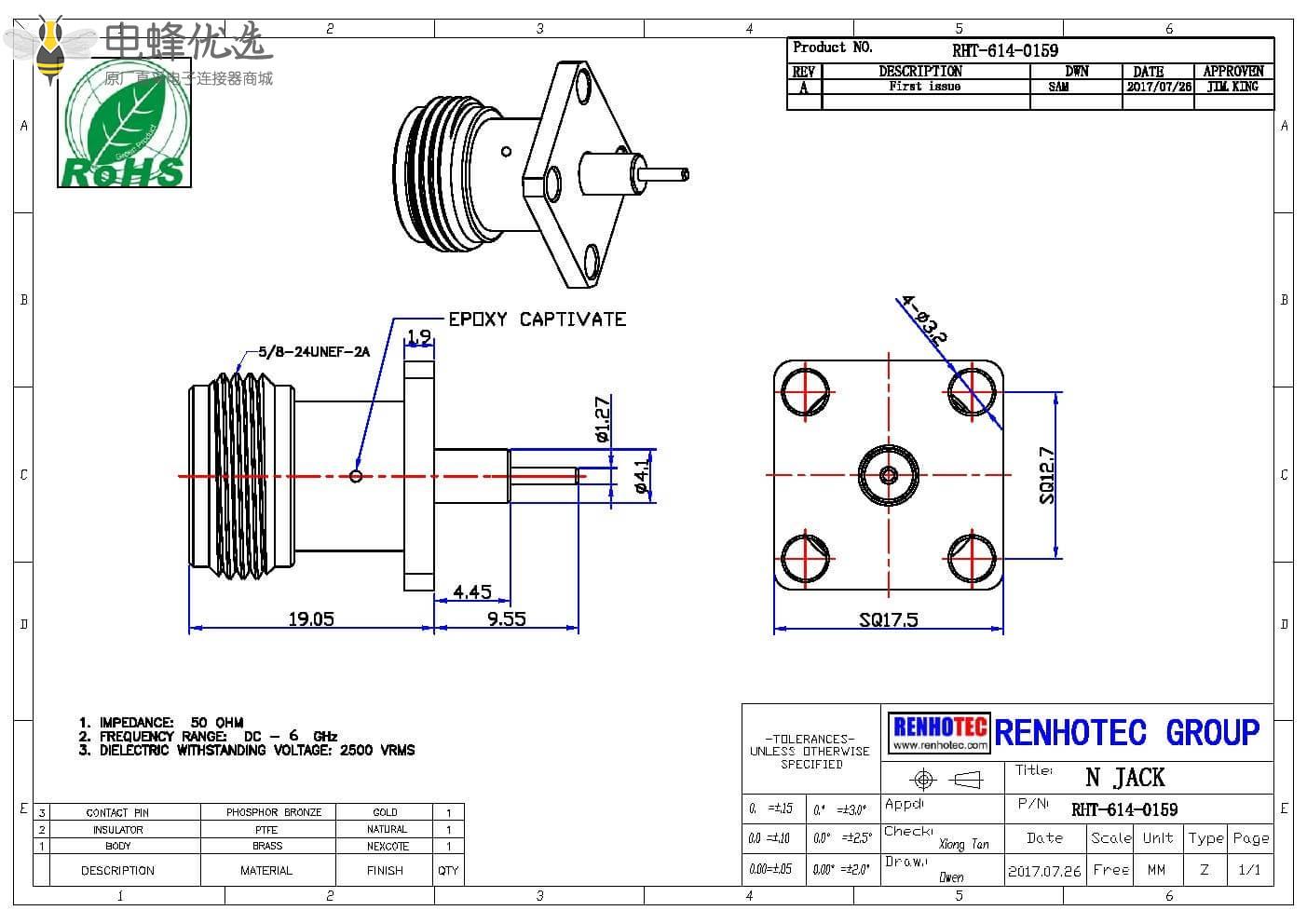 - 高性能连接器,频率范围达0到11GHz,阻抗50欧姆;