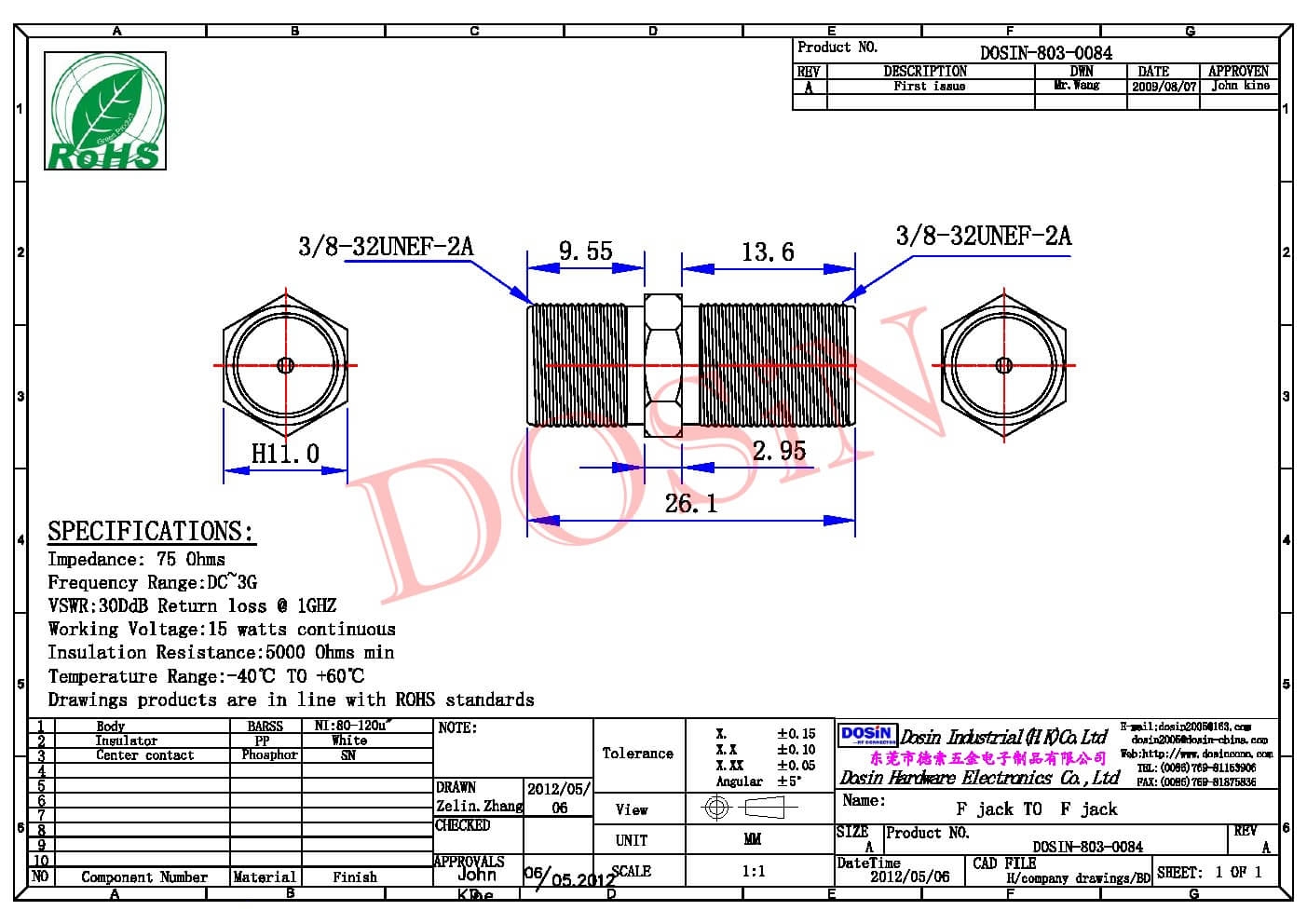 - 中心接触电阻: ≦ 10 mΩ (Milliohms max.)